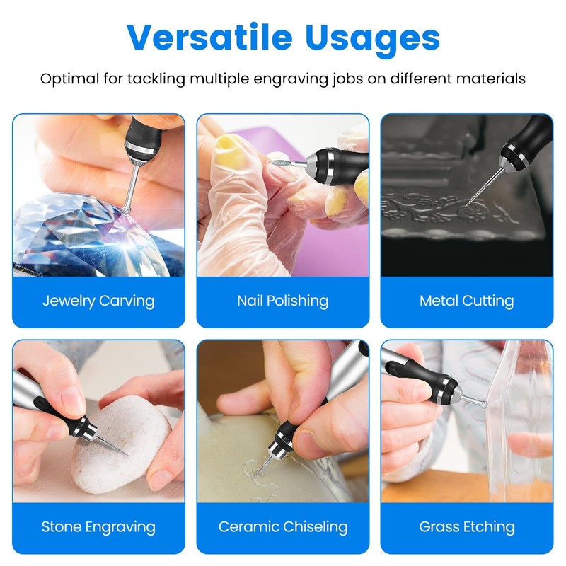 • 🎨 **Wide Range of Applications**: From glass and metal to wood, stone, plastic, and ceramics, this electric engraver is ideal for engraving, sanding, polishing, cutting, and grinding a variety of hard materials. Unleash your creativity to personalize jewelry, create custom gifts, or make intricate artwork. Whether for DIY projects or professional tasks, this engraving tool will become your go-to companion!