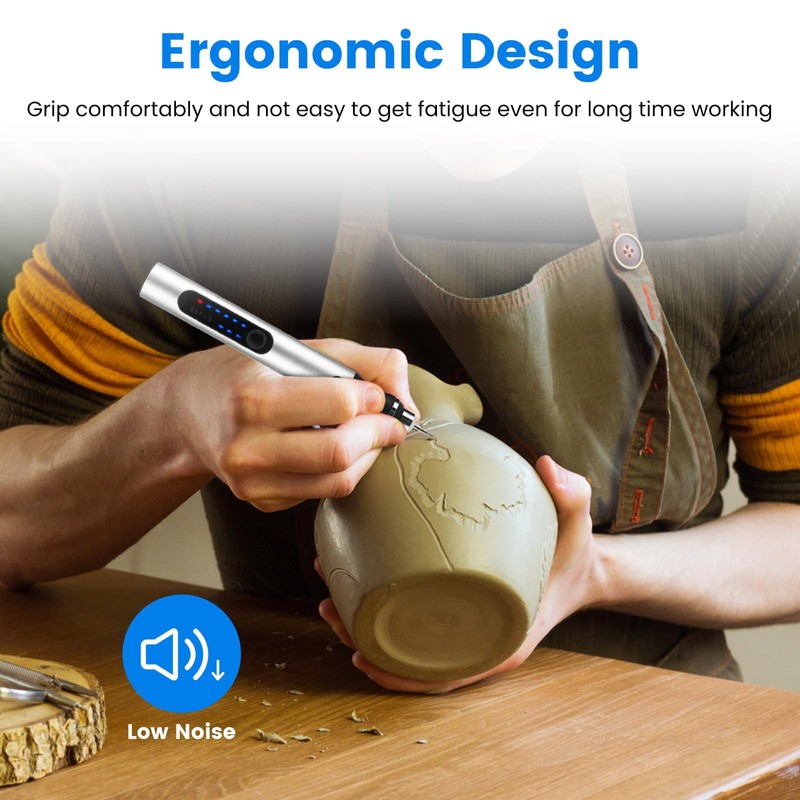 The rechargeable engraving pen is powered by a high-capacity battery and features a powerful motor that delivers speeds of up to 18,000rpm. With 3 adjustable speed levels, you can fine-tune the power to your preference for precise control over your artwork. The ergonomic, pen-like grip ensures a comfortable experience, allowing for maximum precision and stability during use.