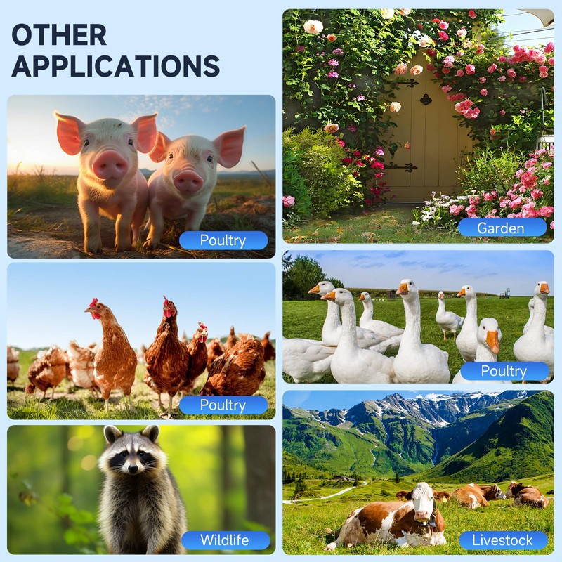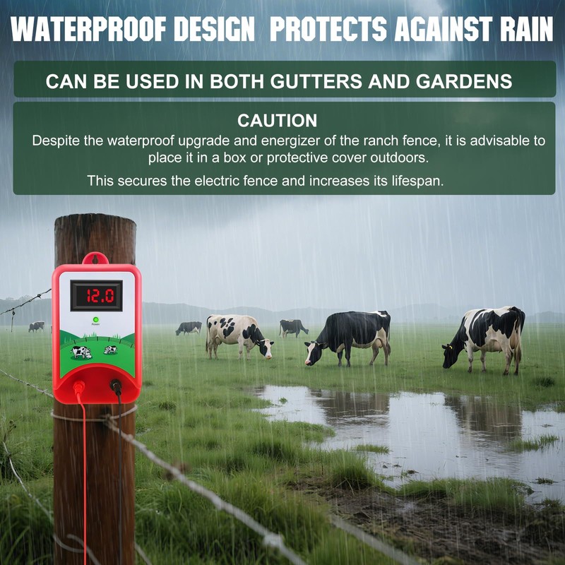 - 【12V Electric Fence Energiser】This electronic fenc is suitable for farms, poultry farms, hunting grounds, orchards, and more. It prevents poultry, livestock, and pets from escaping the designated area and also blocks the intrusion of foreign animals or wildlife