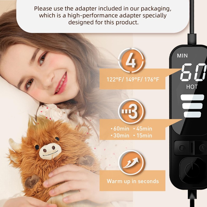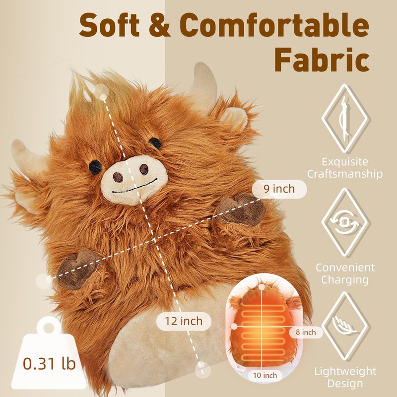 - 【Cute Design & Quality Build】 Our 12×9inch heating pad, shaped like a charming highland cow, is both practical and charming. With a lifelike look and a soft feel, it doubles as cute decor. Whether at home or on the go, it brings warmth and coziness. It uses high-quality heating wires and insulated components for consistent performance.
