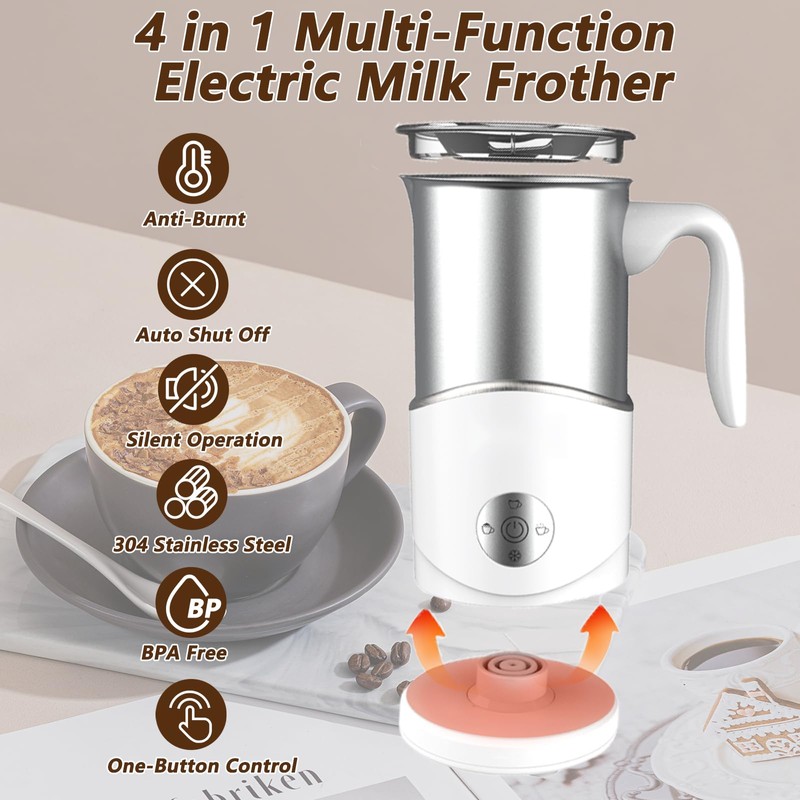 Electric Milk Frother,4-in-1 Milk Frother and Steamer for Coffee - Warm & Cold Foam with Anti-burn Propeller, 350ml Capacity, Easy to Clean, perfect for Cappuccino, Latte, and Choc, BPA Free (white)