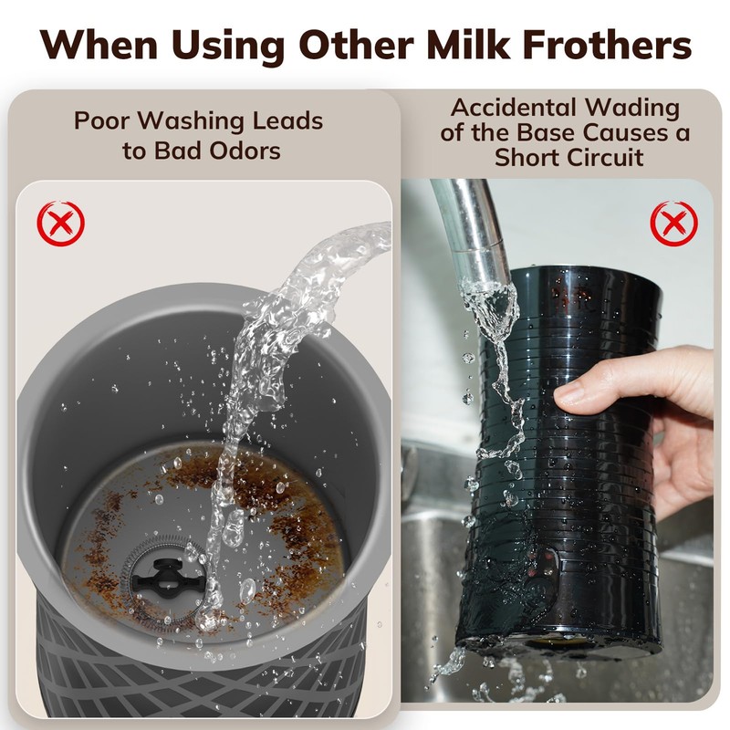 - Our automatic milk frother features high-quality glass construction, making cleaning a breeze. Unlike many non-detachable milk foamer, ours is dishwasher safe for added convenience.To ensure optimal performance, please wipe off water stains from the base of the milk jug after each cleaning.