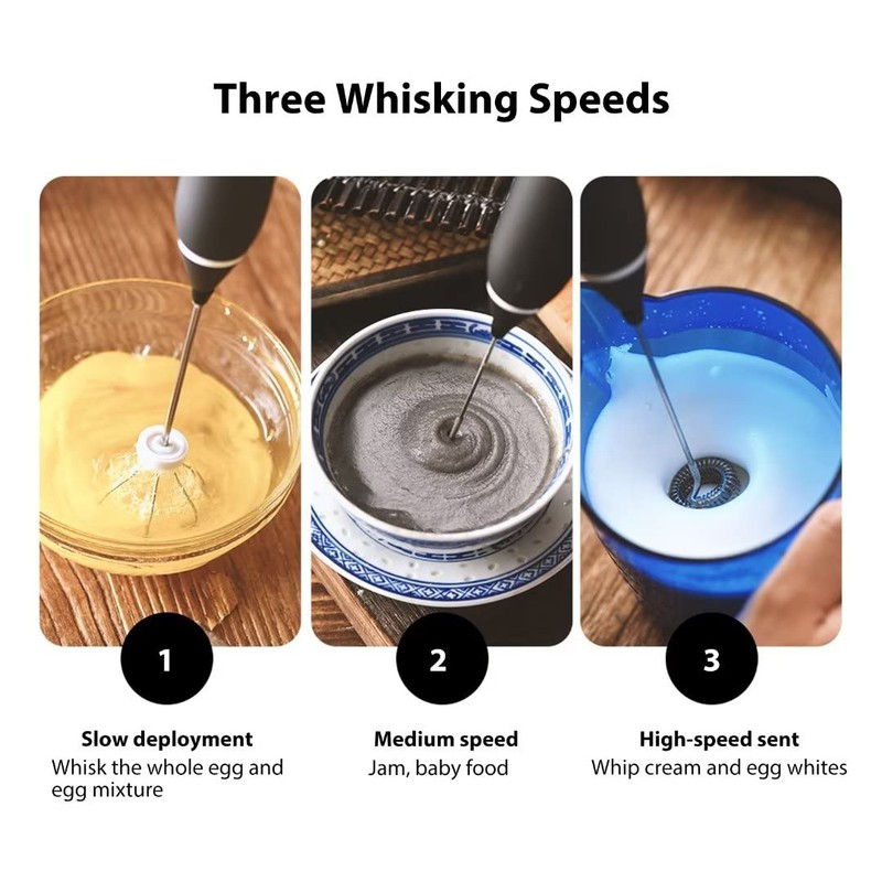 The electric milk frother has 3 speeds, simply press the button to turn on and pressing the ON/OFF switch in turn to tune the speed from medium to high speed.
