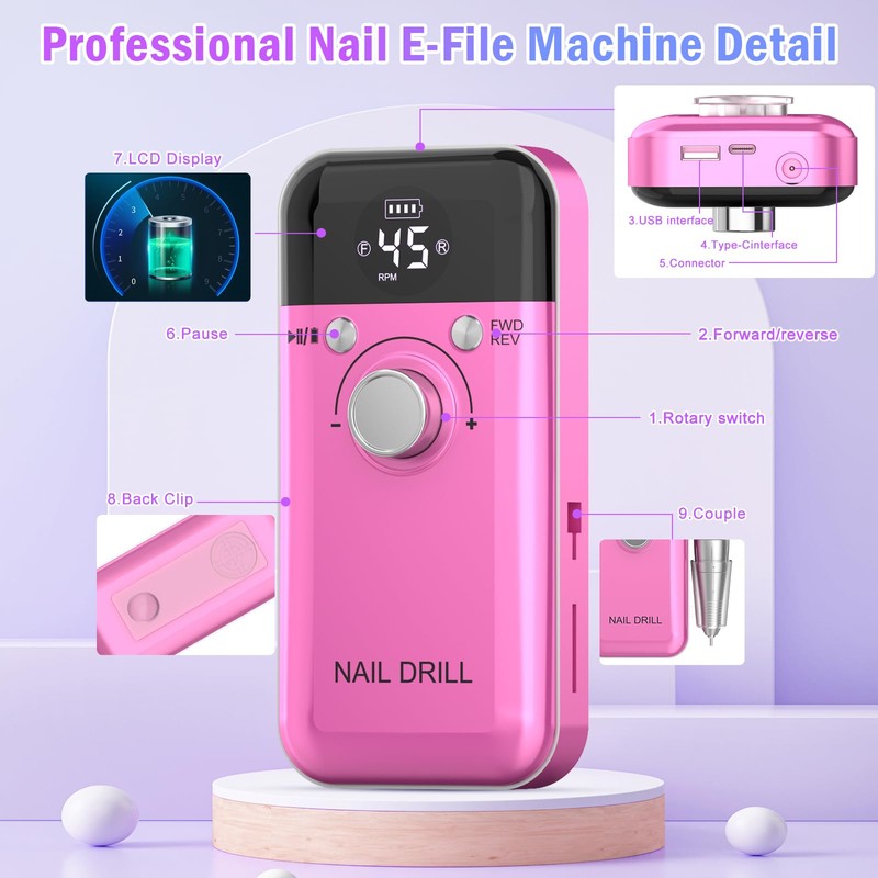 - [Portable LED Screen Display Nail Drill]Portable rechargeable nail drill smart LCD screen displays the operation status, including RPM,forward/reverse and battery level, which is convenient for you to adjust the manicure speed and reminds you to recharge it in time.Just charge for 1 hour and you can use it for up to 8 hours.equipped with a cover that can snap the sanding pole onto the main body,lightweight design allows you to carry it anywhere, in your pocket, bag, and there is a clip on the back so you can hang it on your clothes.