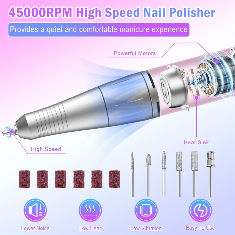 - [Ultra Quiet,Low Heat,Low Vibration]This professional salon grade electric nail file provides a quiet and comfortable manicure experience. Efficient performance with low noise,intelligent heat dissipation system and low vibration. The lightweight yet sturdy construction ensures a comfortable grip,delivers powerful yet quiet torque, and virtually imperceptible vibration during use, ensuring that long hours of use won't cause fatigue or discomfort.