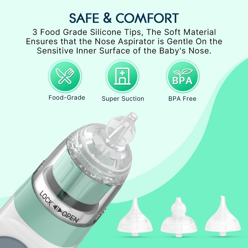 Electric Nasal Aspirator for Baby, Nose Aspirator for Toddlers, Waterproof Baby Nose Sucker, Nose Cleaner with 3 Silicone Tips, Adjustable Suction Level, Music and Light Soothing Function,Green