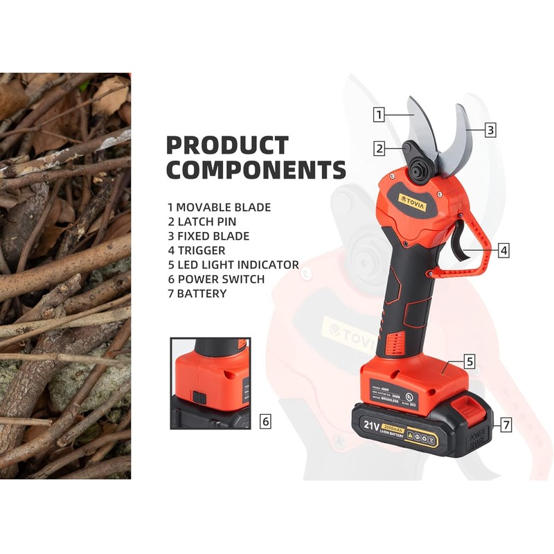 • 【VERSATILE APPLICATIONS】T TOVIA electric pruning shears is designed for maximum efficiency in a wide variety of applications in gardens, parks, farms, orchards, greenhouses, and anywhere that a portable, light weight, self-contained purner is required.