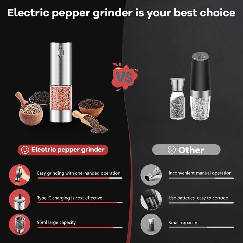 • Rechargeable design: The electric salt and pepper grinder has a Type-C charging cable, which can be recharged for continuous use. Once charged, it can be used daily for a long time, improving your shopping cost-effectiveness