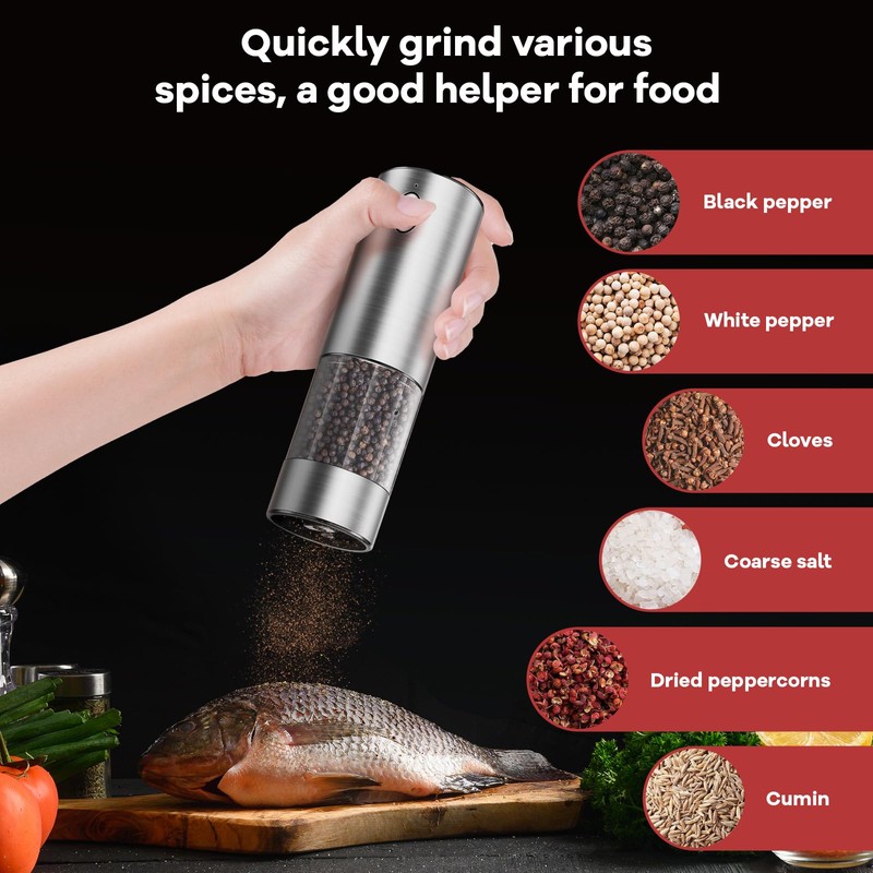 Our amazing electric salt and pepper grinder is made of high-quality stainless steel and ABS, which is perfect for weddings, birthdays, housewarmings, Mother's Day, Father's Day and Christmas. Surprise your loved ones. The grinder can be a special gift for women and people who love cooking