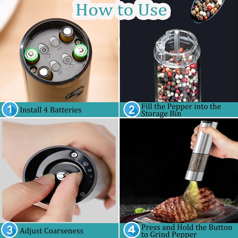 - 【Battery Powered One Button Operation】Salt and pepper grinder is battery powered and requires 4 AAA batteries ( not included ). Effortlessly grind your spices by simply pressing the switch. Release it to stop, allowing you to control amounts of salt or pepper while cooking