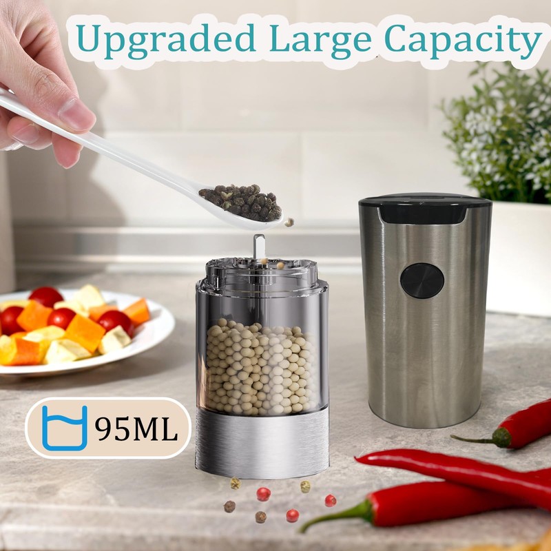 - 【Large Capacity and Visualize Bottle Body】Automatic salt pepper mill grinder features a large 360° clear container to minimize refills. The large capacity of 95 ml allows you to easily see the remaining spices and distinguish between different seasonings, and reduce waste. And easy to clean the residues with the included brush after each grinding
