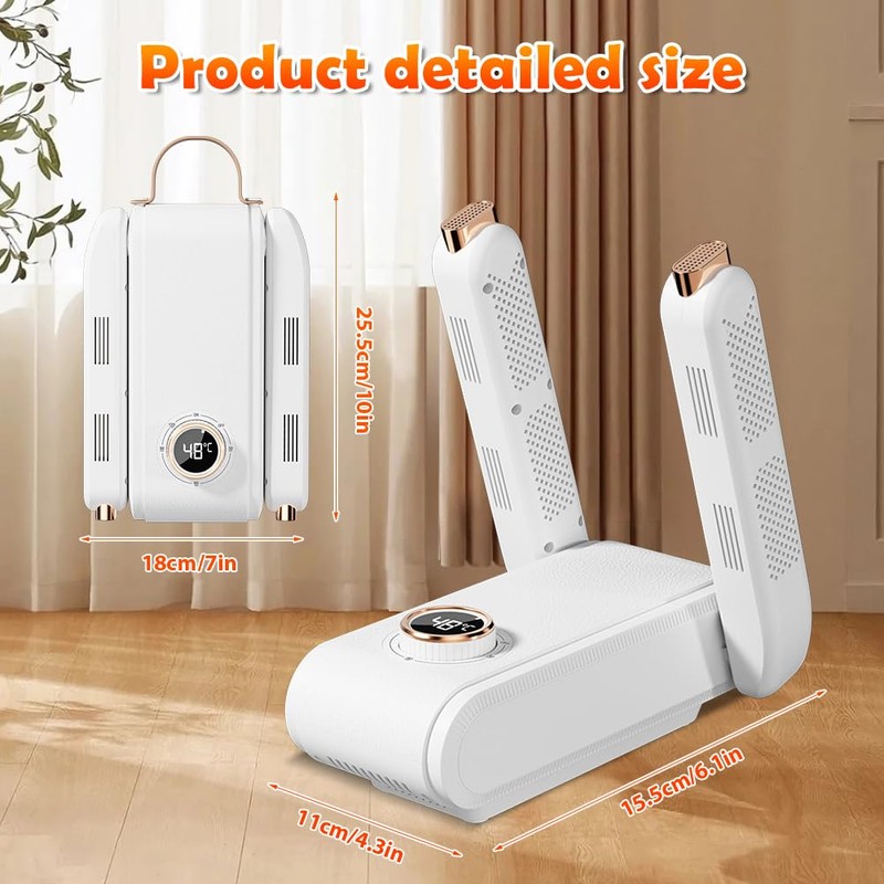 - Compact & 90° foldable: With its clever 90° folding mechanism, the shoe dryer can be stowed away to save space. Whether at home or on the go, the portable shoe warmer fits easily into your backpack and is ideal for travel. The integrated leather handle allows you to easily hang it on the wall or store it in drawers.