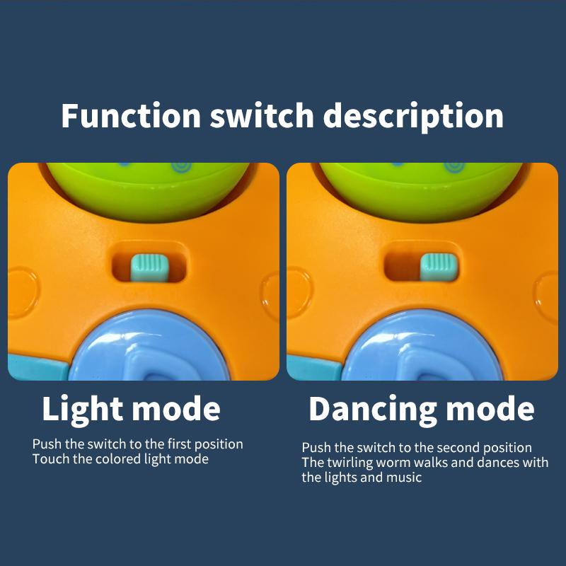 【2 Modes】The toy features 2 modes, including the lights mode and dancing mode. Push the switch to the 1st position, and the colored lights flash, push the switch to the 2nd position, the toy wiggles and dances with the lights and sounds.