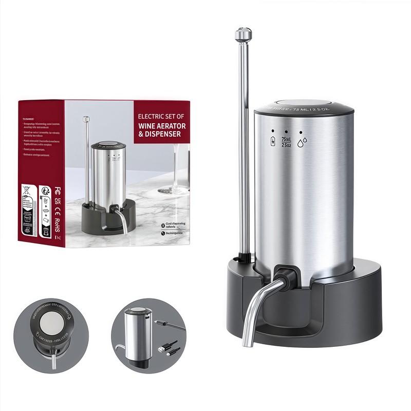 - Rechargeable Electric Wine Pourer: Transfer wine with controlled flow. Includes base, detachable stainless steel tube, USB-C cable. Packaged with instructions.