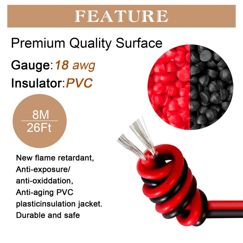 - Good quality: our 18AWG 8M 2-core PVC wire with a cross-sectional area of 0.8 mm² consists of 41 strands made of 0.16 mm tinned copper wire