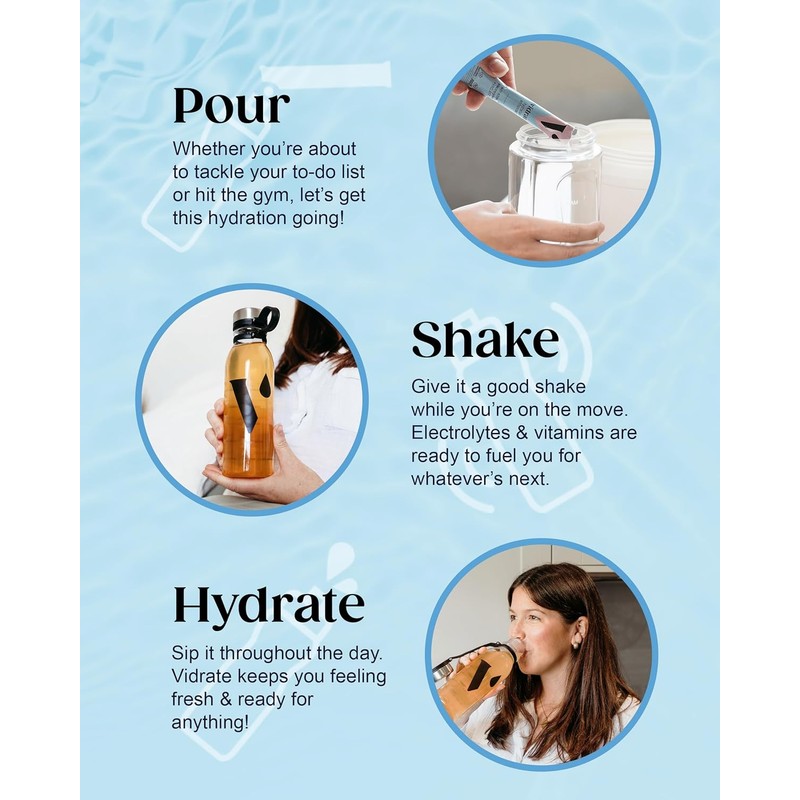 - Embrace Versatile Hydration Anytime, Anywhere: Transform your hydration habits with ViDrate's electrolyte sachets easy 3-step process. Pour, Shake, Hydrate! These can be served hot or cold, perfect for mixing in 500-700 ml of water.