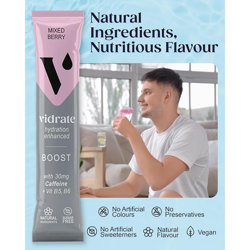 - Combat Afternoon Slumps Now: Experience the natural energy lift with ViDrate Boost hydration powder. Enriched with electrolytes and vitamins B5 & B6, this electrolyte powder improves your productivity and focus, making it the perfect afternoon pick-me-up.