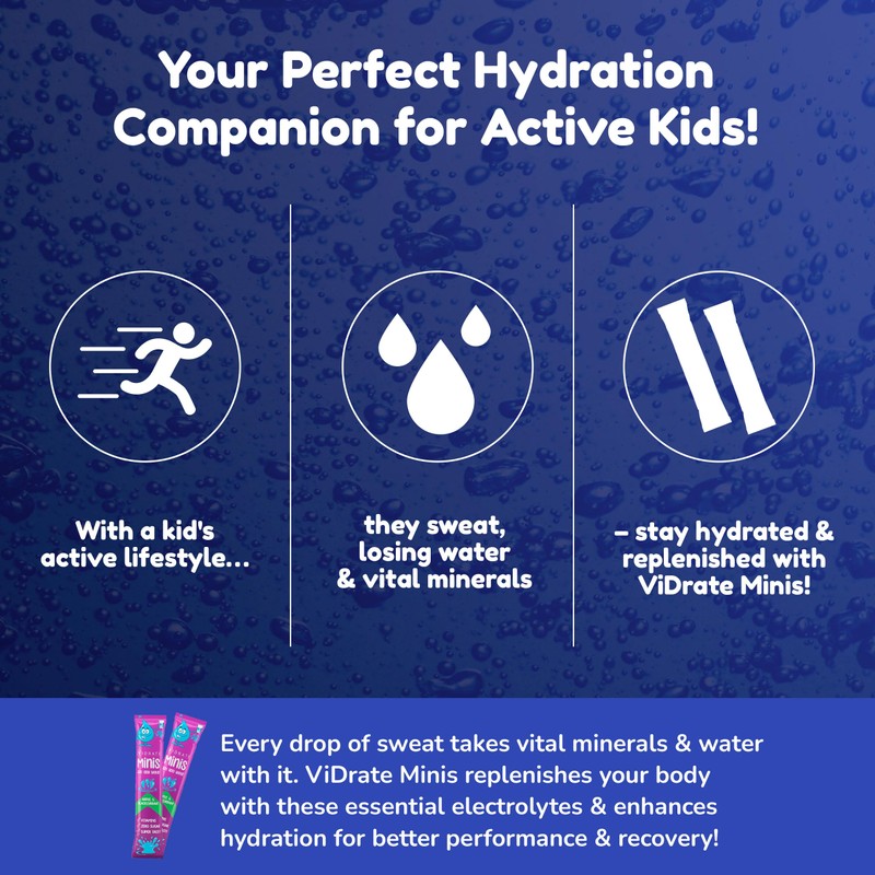 - Add a Vitamin Punch to Your Little One's Day: Each ViDrate Minis rehydration sachets electrolyte enhances your child's daily vitamin intake. These electrolytes sachets are bursting with 7 essential vitamins, supporting your child's everyday wellness.
