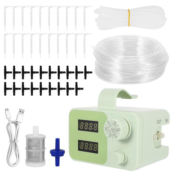 - đŠăSmart Watering with LED Display & Dual KnobsăKeep plants thriving effortlessly with this 3.7V, 4W automatic watering system. The LED dual-screen display and intuitive two-knob control let you set watering intervals (1hâ30d) and duration (1â300s) with precision. Doubles as a digital clock and shows battery levels. ABS-built and green for discreet blending with foliage.