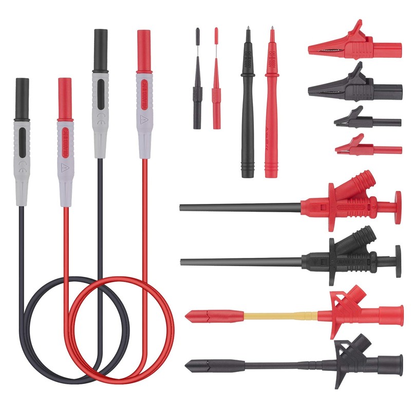- WGGE 017 Test lead set including : 2 × 39"4mm PVC test lead extensions , 2 × Pressure test hook , 2 × Test clip of plunger grabber, 2 × 2mm test probe , 2 × safety clips (jaw opening 20mm) , 2 × safety clips (jaw opening 10mm) , 2 × test probe with 0.8mm brass pin. (14 pieces)