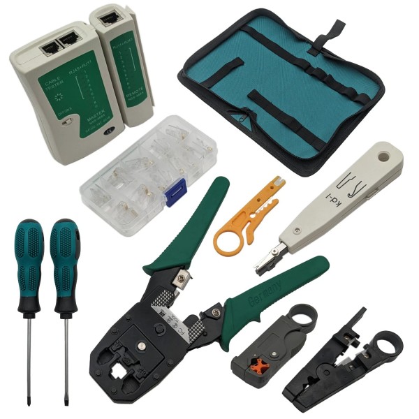 - 9 Piece Networking Tool Set - Includes network cable tester for RJ45 and RJ11/RJ12, ethernet cutting, stripping, and crimping tool (for 8P8C/RJ-45, 6P6C/RJ-12, 6P4C/RJ11), 20 modular plugs, Krone type punch down tool (NOT FOR 110 MODES), along with a dedicated cable stripper, coaxial cable stripper, mini stripper / cutter, one #1 phillips and one 3mm flat head screwdriver. All tools come in a convenient zippered storage case for portability.