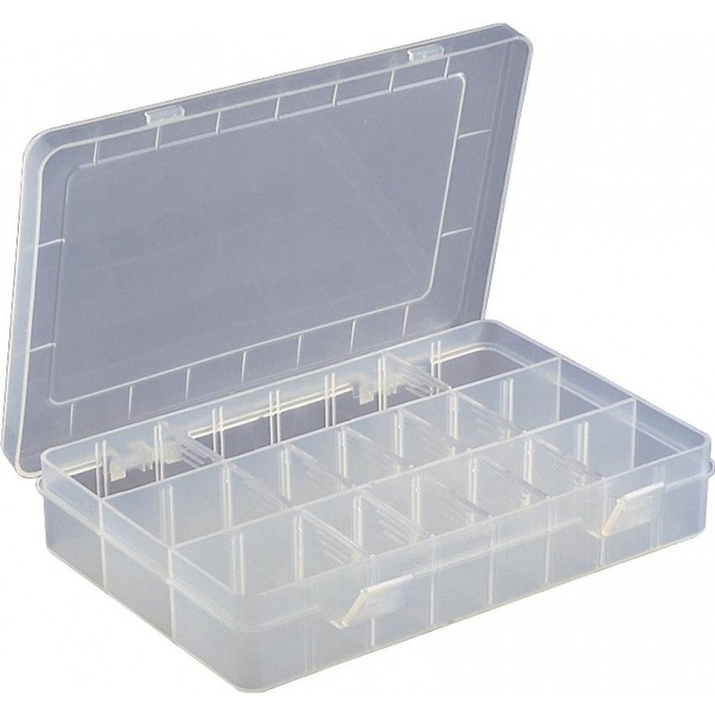- A sturdily constructed plastic storage box with a semi-transparent hinged lid and fastening clip. Supplied with moveable dividers allowing creation of up to 15 different-sized compartments.