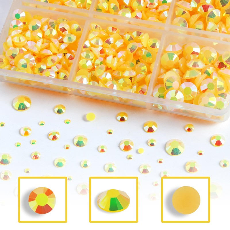 - This set of jelly rhinestones comes in 5 sizes, 2mm-5300 pcs,3mm-1400 pcs,4mm-740 pcs,5mm-800 pcs,6mm-160 pcs, and is packed in two plastic boxes to store various sizes separately.