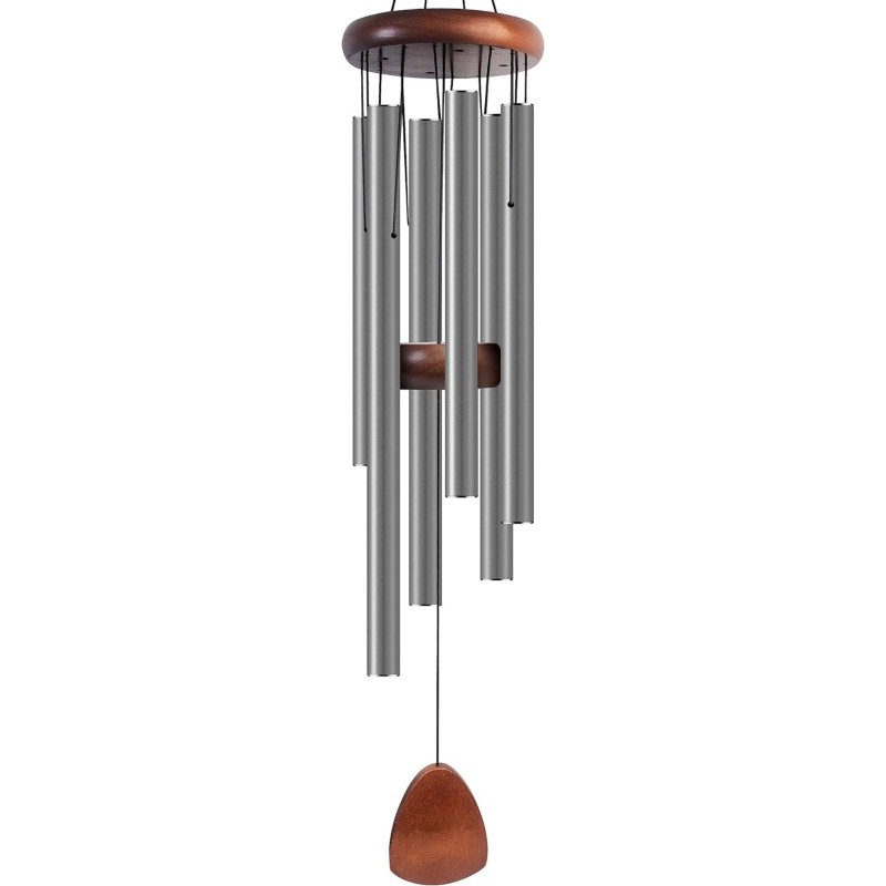 With a total length of 37 inches from the S-shaped hook to the wind catcher, this wind chime features 6 classic silver-grey anodized aluminum tubes that range from 8.7” to 12.6” in length. The wear-resistant pine wood adds an exquisite touch, enhancing both durability and aesthetic.