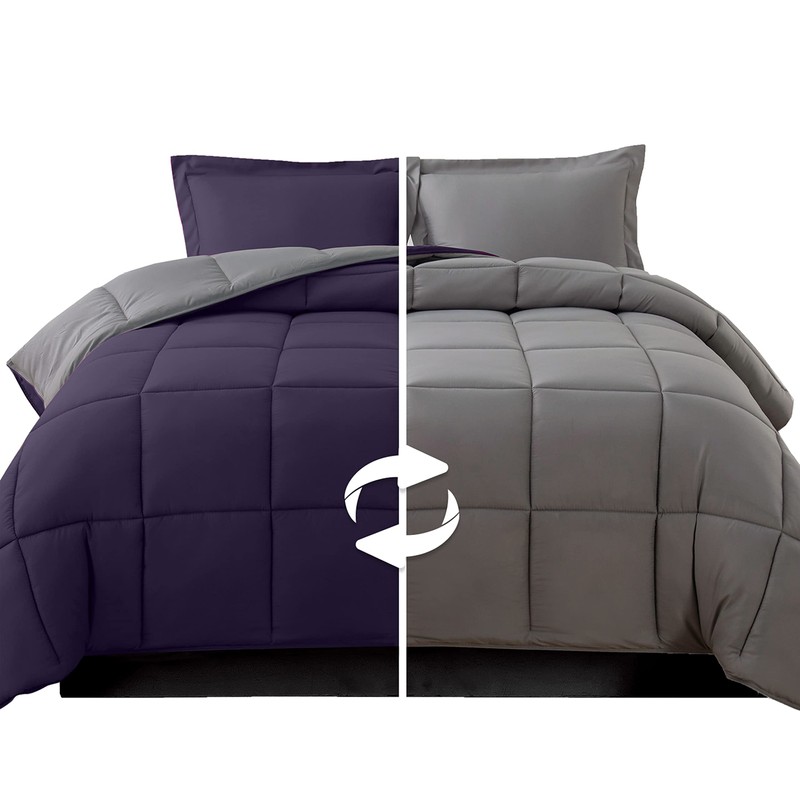 Elegant Comfort 3-Piece Reversible Comforter Set, All Season Cozy, Soft Down Alternative, Quilted - Box Stitched - Duvet Insert with 4 Corner Tabs, Comforter with Shams, Cali King, Purple/Gray