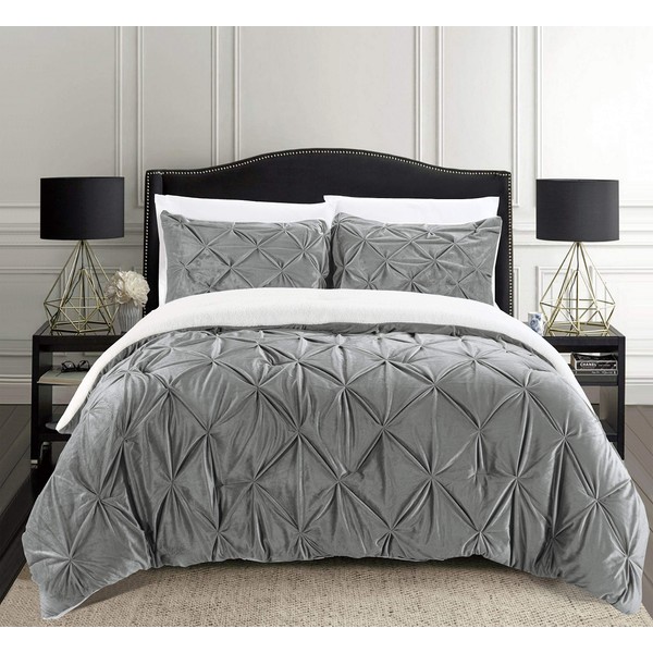 Elegant Comfort 3-Piece Set Pinch Pleated Sherpa Comforter Reversible Down Alternative Luxurious, Breathable, Cozy Fabric, Pinch Pleated Sherpa Comforter, California King, Silver Gray