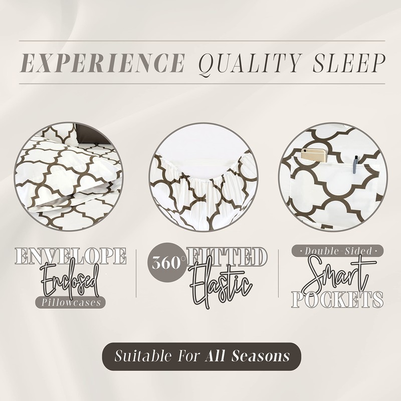 - FEEL THE DIFFERENCE- Our King Size Moroccan Trellis Print Sheet Set includes: 1 King Flat Sheet 105" x 102", 1 King Fitted Sheet 78" x 80", and 4 King Pillowcases 20" x 40". Our sheets are the ultimate upgrade to creating a cozy ambiance, featuring a 1500 thread count comfortable finish.
