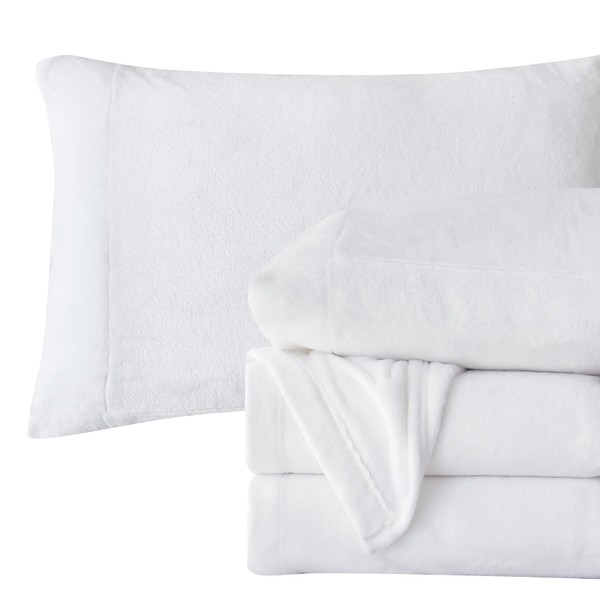 Elegant Comfort Luxuriously Soft 4-Piece Velvet Plush Flannel Sheet Set - Premium Quality - Cozy Warm, Anti-Static, Non Pilling Fuzzy Velvet Flannel Fleece Deep Pocket Sheet Set - Cal King, White
