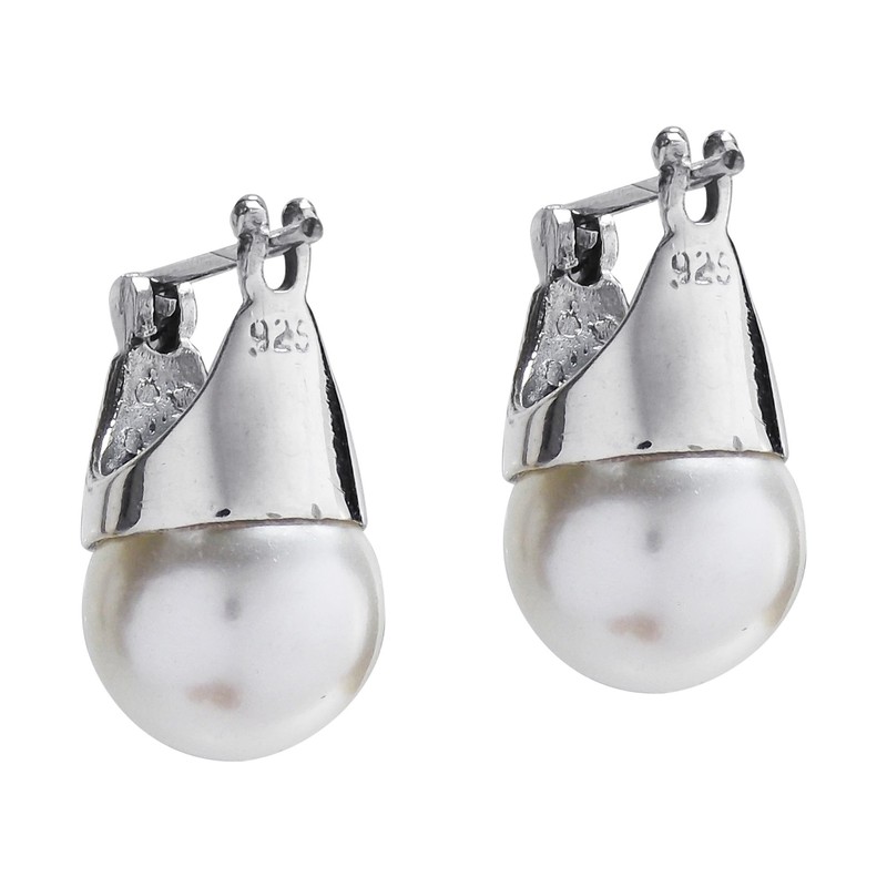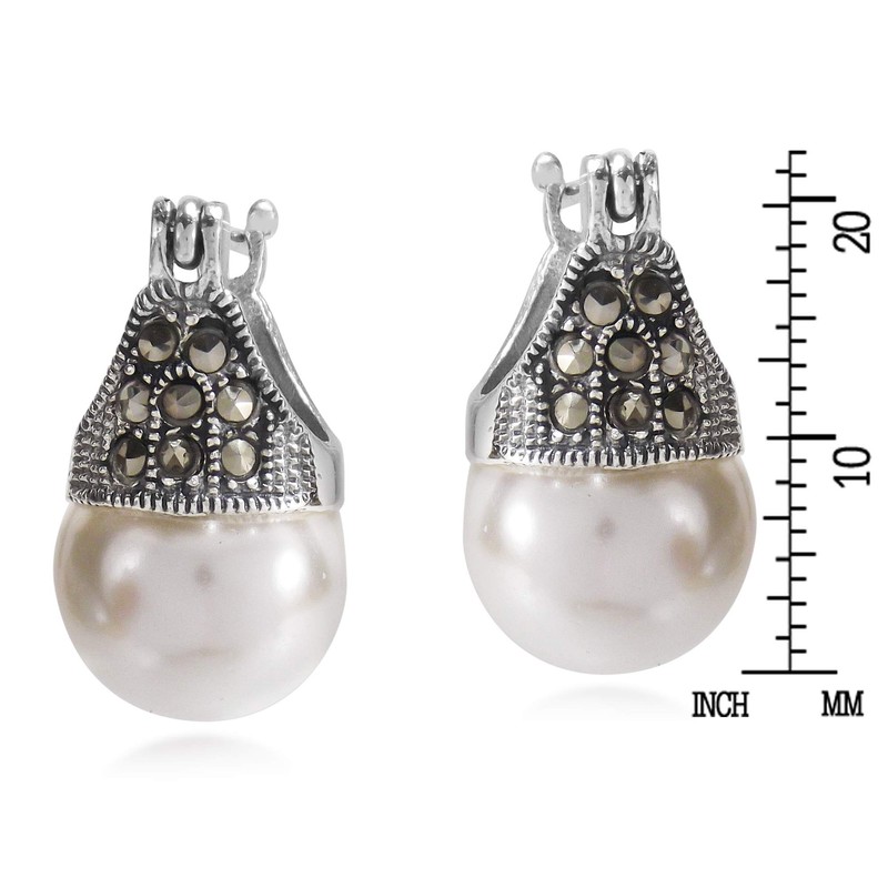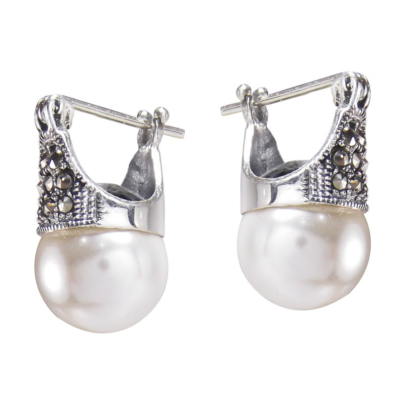 Elegant Crowned White Faux Pearl with Marcasite Style Pyrite .925 Sterling Silver Dangle Earrings