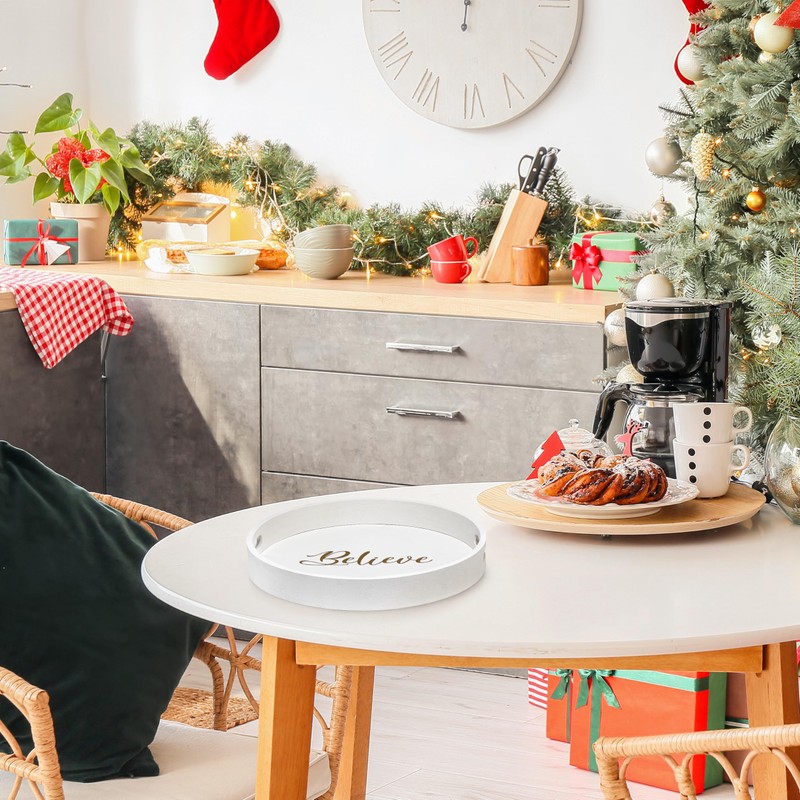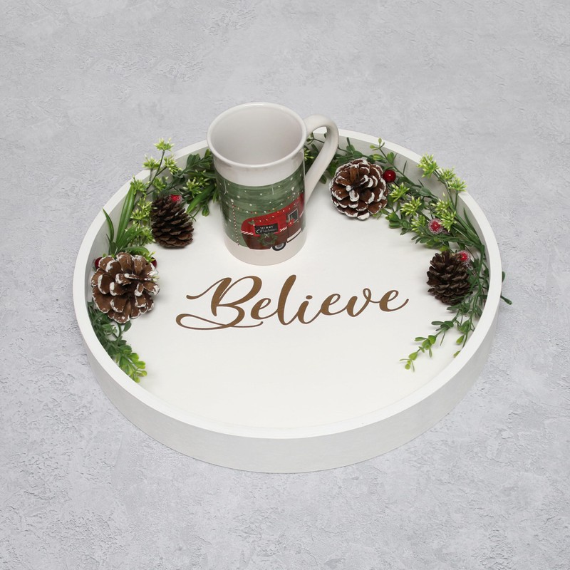 Elegant Designs HG1030-WBV 13.75" Sip & Serve Stylish Wooden Decorative Serving Tray, for Home Décor, Living Room, Counter, Believe in White Wash with Gold Font