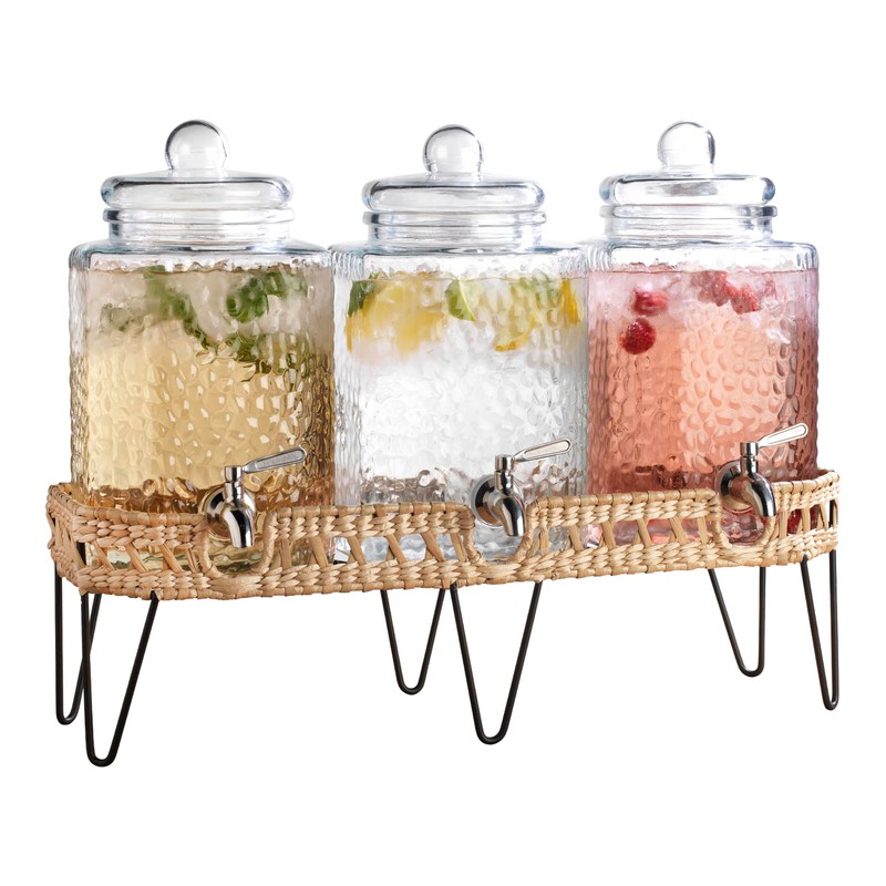 - Premium Glass - Constructed with premium grade durable glass with a beautiful hammered design. This dispenser will be a beautiful centerpiece wherever you use it. Includes a beautiful rattan stand for a nicer display. Great for outdoor, bars, & parties.