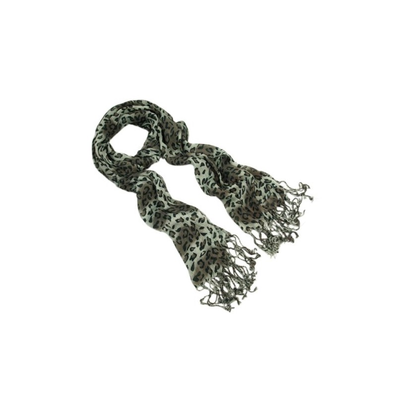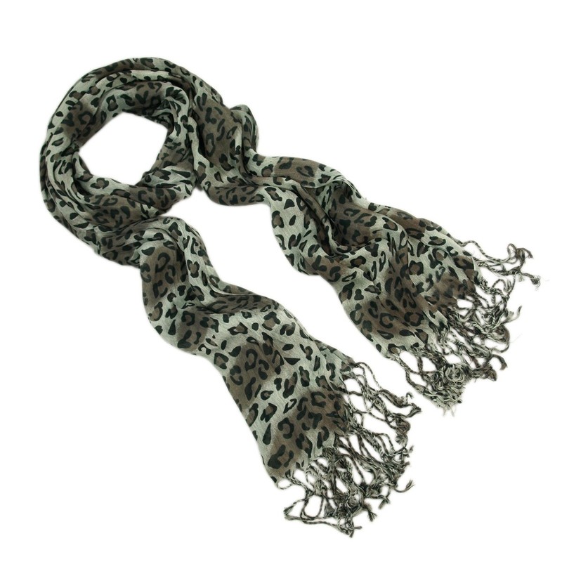 Elegant Leopard Animal Print Scarf with Fringe, Gray/Brown