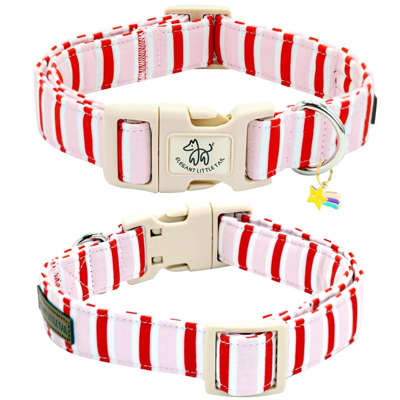 Elegant little tail Dog Collar, Cute Pink with Red Strip Pattern Pet Collars Soft Girl or Boy Adjustable Cotton Puppy Collar with Quick Release Buckle for Medium Dogs