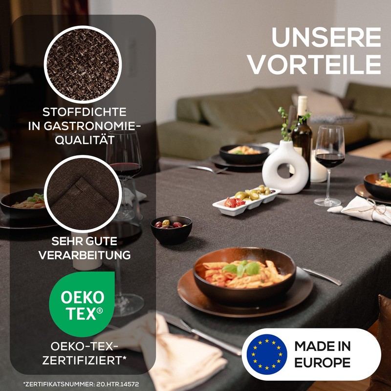 The high-quality material is not only durable and easy to clean, but also tested for free from harmful substances. Thanks to the Ökotex certification, you can be sure that the Beautex linen tablecloth meets the highest quality standards. The combination of water-repellent surface and durable workmanship ensures that you will enjoy this stylish tablecloth for a long time.