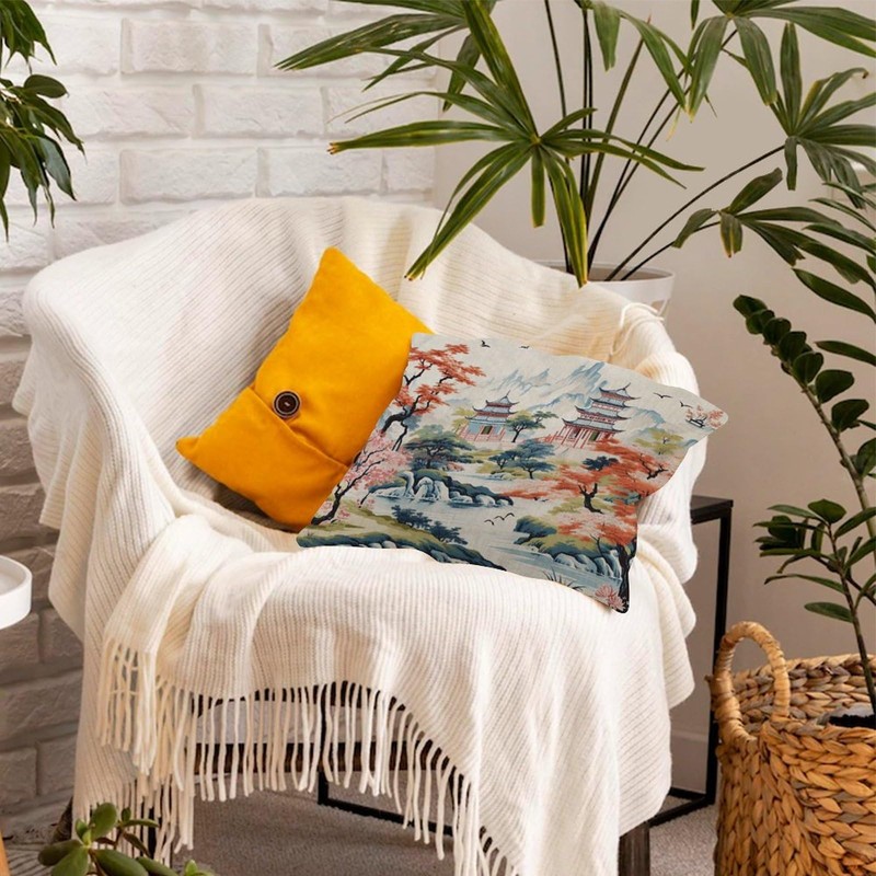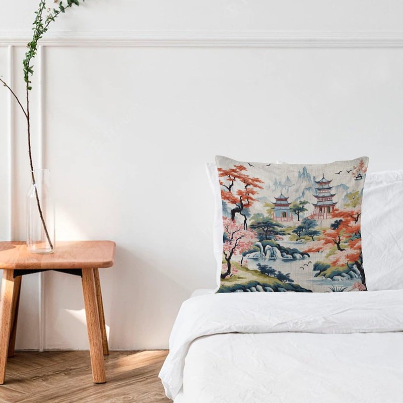 Elegant Throw Pillow Cover 22x22in Chinoiserie Asian Pagoda White Coral Blue Décor Soft Pillowcase Flower Asian Inspired Eurosham Cotton Linen Accent Pillows for Playroom Bed Sofa