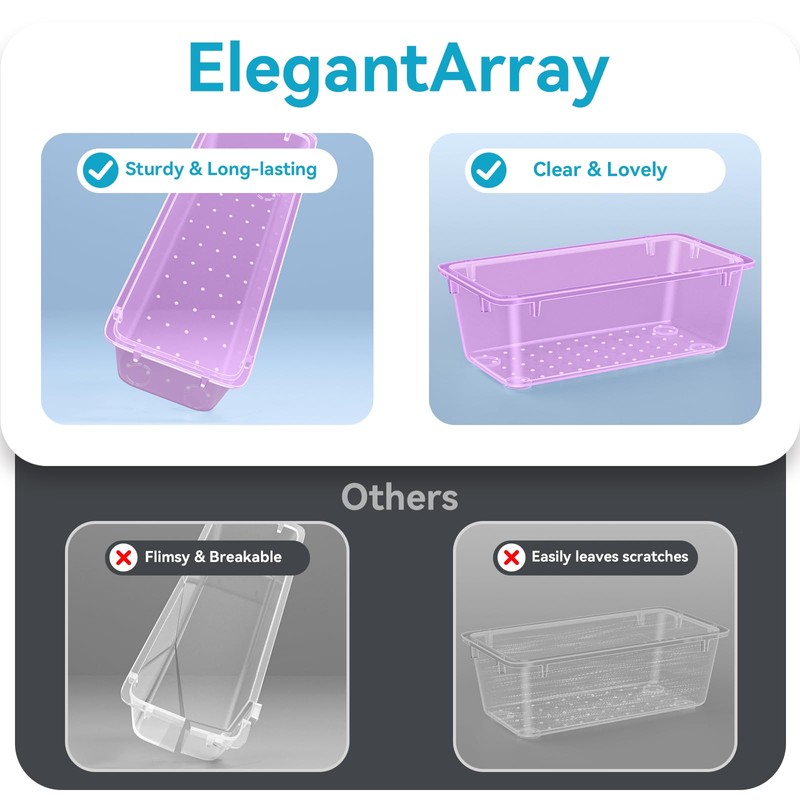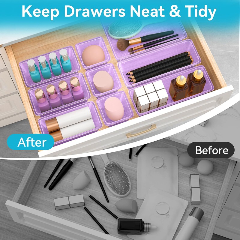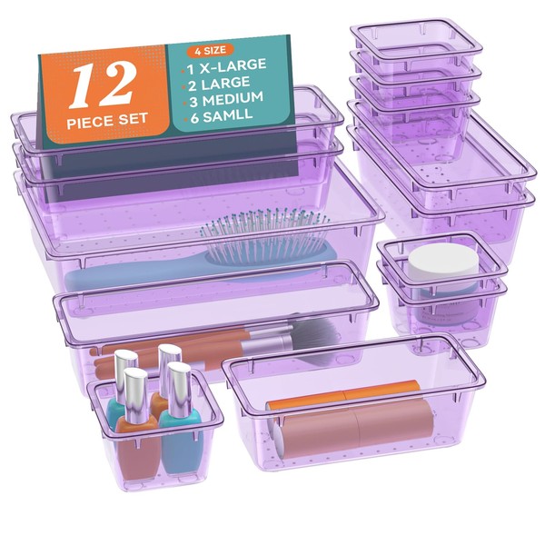ElegantArray 12-Piece Drawer Organizer Set, 4 Sizes Versatile Plastic Vanity Organizer for Makeup, Stationery, Gadgets, in Kitchen, Bathroom, Office, and Bedroom, Purple