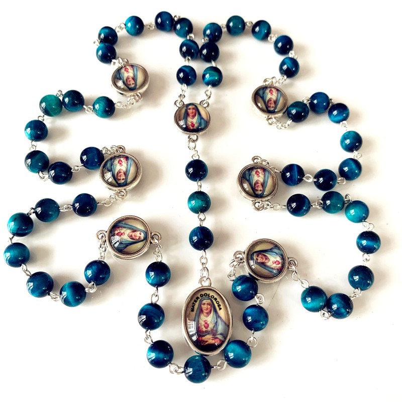 - elegantmedical HANDMADE RARE Peacock buleTiger Eye Jade Beads SEVEN 7 SORROWS MARY MEDAL Rosary Necklace Catholic GIFTS