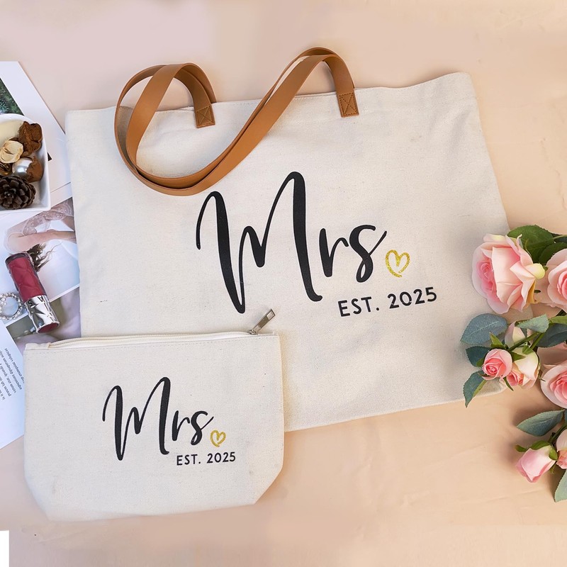 - Wedding Gifts for Bride: The mrs tote bag and the cosmetic bag are both decorated with the black word of "Mrs. Est 2025" and gold heart design, a thoughtful and practical gift for any bride , bride-to-be, Mrs or wifey.