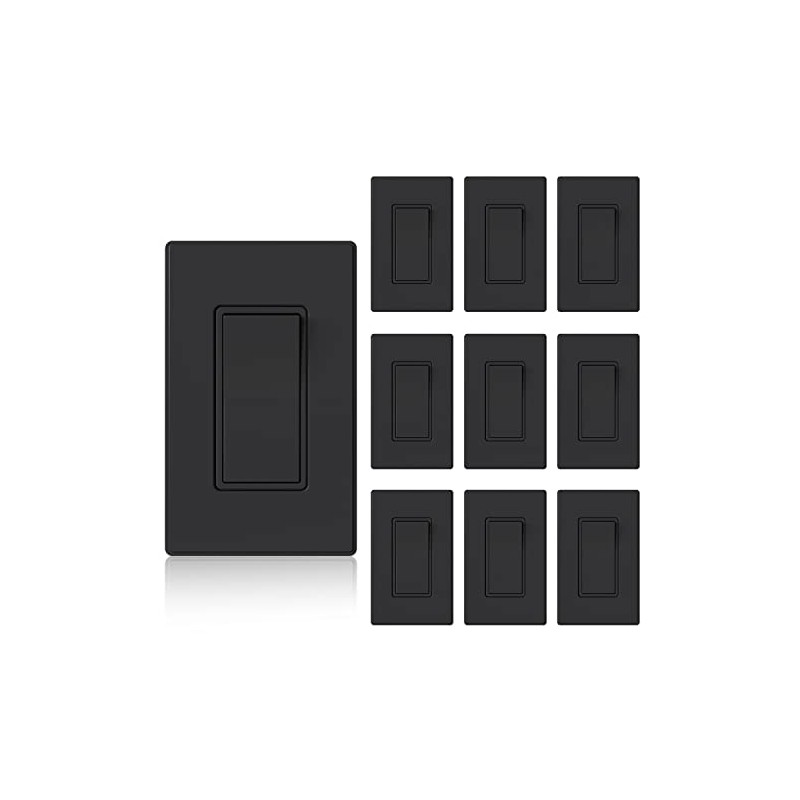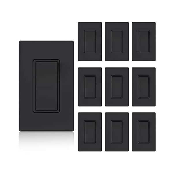 ELEGRP Matte Black Single Pole Decorator Light Switch, 15Amp 120/277V, Paddle Rocker Switch Wall Switch Replacement, Self-Grounding, Residential Grade, w/Wall Plate, UL/CUL (10 Pack)