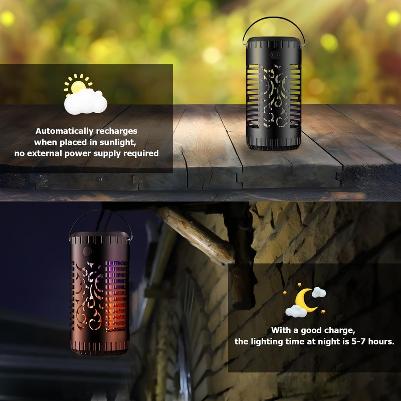 - 【Realistischer Flammen-Effekt】 Diese Solar-Außenhoflampe kann einen realistischen Flammenlichteffekt simulieren und einen lebendigen Effekt des Flammentanzes erzeugen. Ihr warmes Licht schafft eine warme Atmosphäre.Sie es problemlos auf der Terrasse oder irgendwo in der Nähe des Grills aufstellen. Die Installation ist ebenfalls sehr einfach und erfordert keine Verkabelung. Sie muss nur an einem sonnenbeschienenen Ort platziert werden.