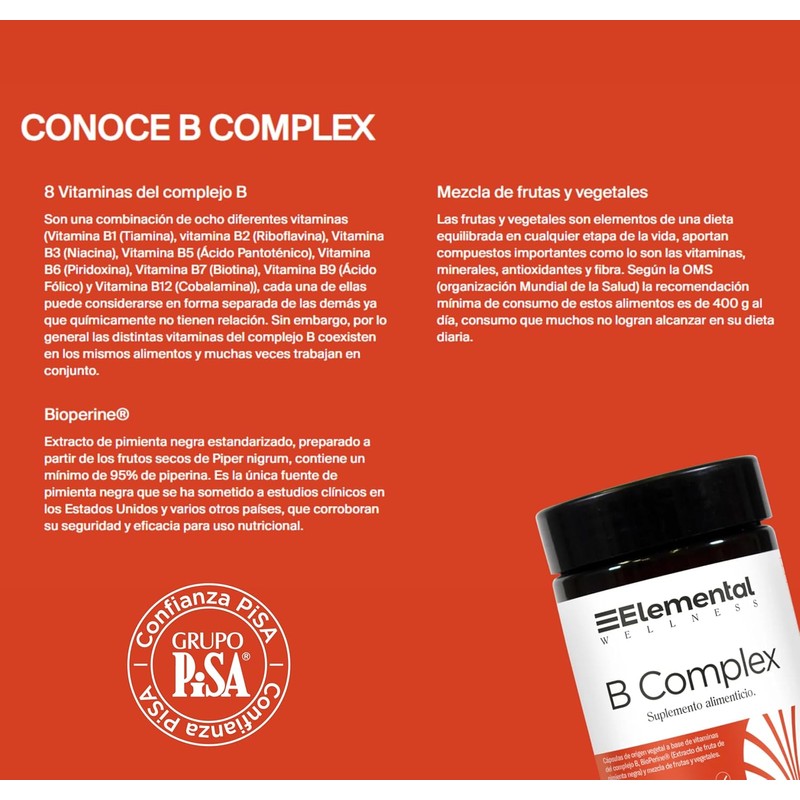 ¡Eleva tu energía y potencia tu salud diaria de manera natural! 🌟 Nuestro Complejo B Elemental combina todos los beneficios esenciales de las vitaminas B, frutas, verduras y BioPerine para ofrecerte una fórmula completa y altamente absorbible. 🍋🥦