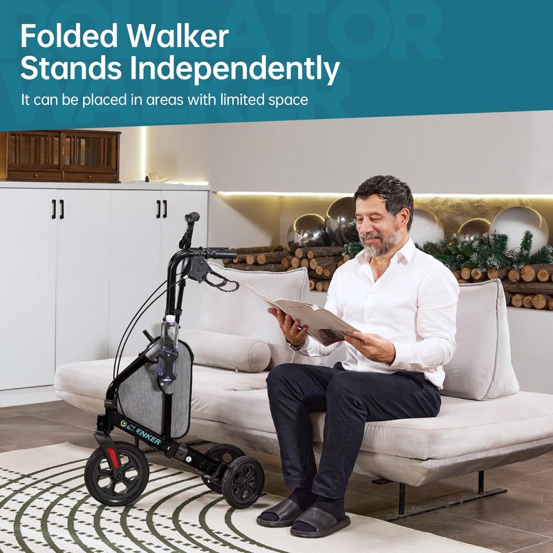 ELENKER All Terrain 3 Wheel Walkers for Seniors, 3 Wheeled Rollator with 10” Wheels, Narrow Walkers for Small Spaces, Compact Folding, Ideal for Traveling, Black