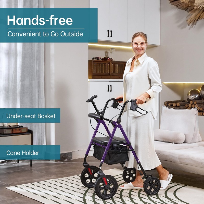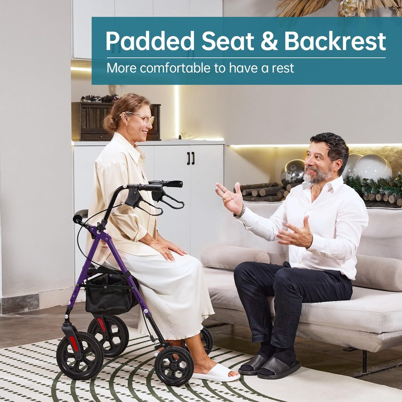 ELENKER All Terrain Rollator Walker for Seniors with 10” Wheels, Sponge Padded Seat and Backrest, Fully Adjustment Frame, Purple