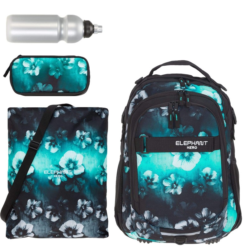 Elephant Hero Signature School Backpack 4-Piece Set Boys Girls Backpack Sports Bag Pencil Case Bottle 12723, Flower black/turquoise (gradient), School backpack