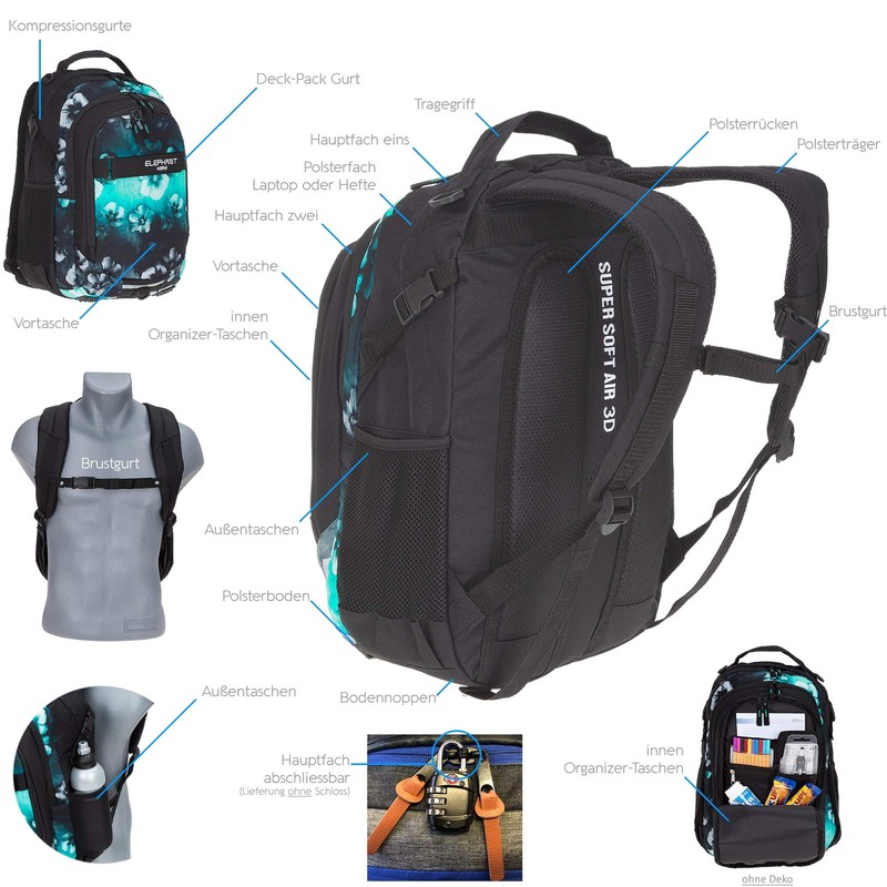 Elephant Hero Signature School Backpack 4-Piece Set Boys Girls Backpack Sports Bag Pencil Case Bottle 12723, Flower black/turquoise (gradient), School backpack