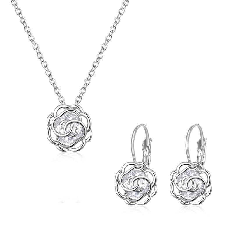 EleQueen Gorgeous Cubic Zirconia Camellia Flower Jewelry Set for Women Girls, Bridal Flower Necklace Earrings Set Jewelry Gift White Silver-Tone